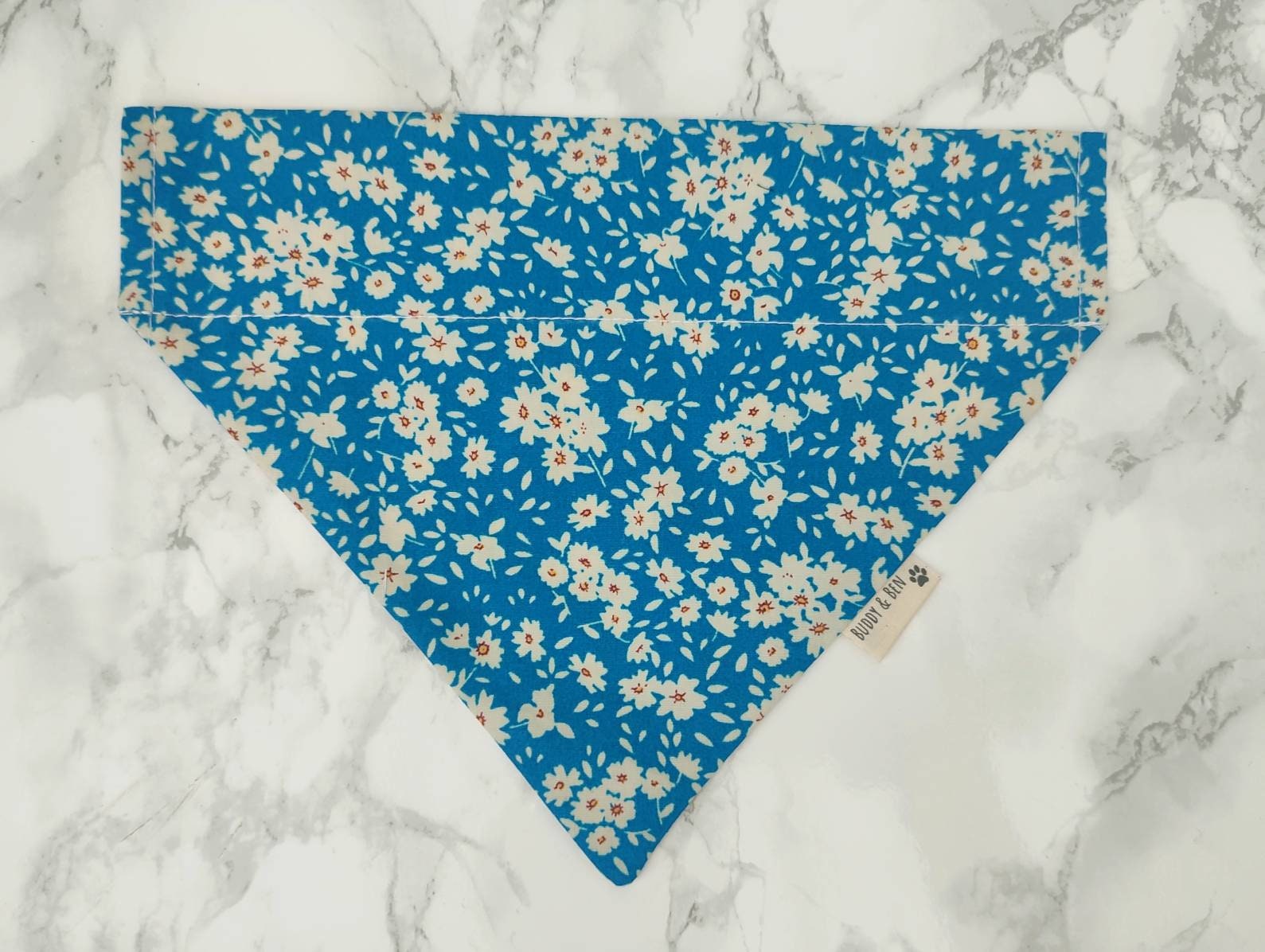 Teal Ditsy Daisies Dog Bandana. This bandana features a beautiful white daisy flowers on a vibrant Teal background. The reverse side of the bandana features the same design.