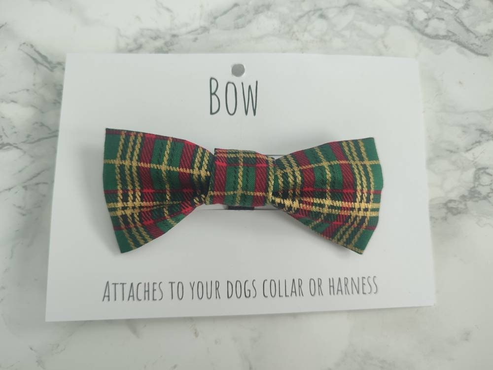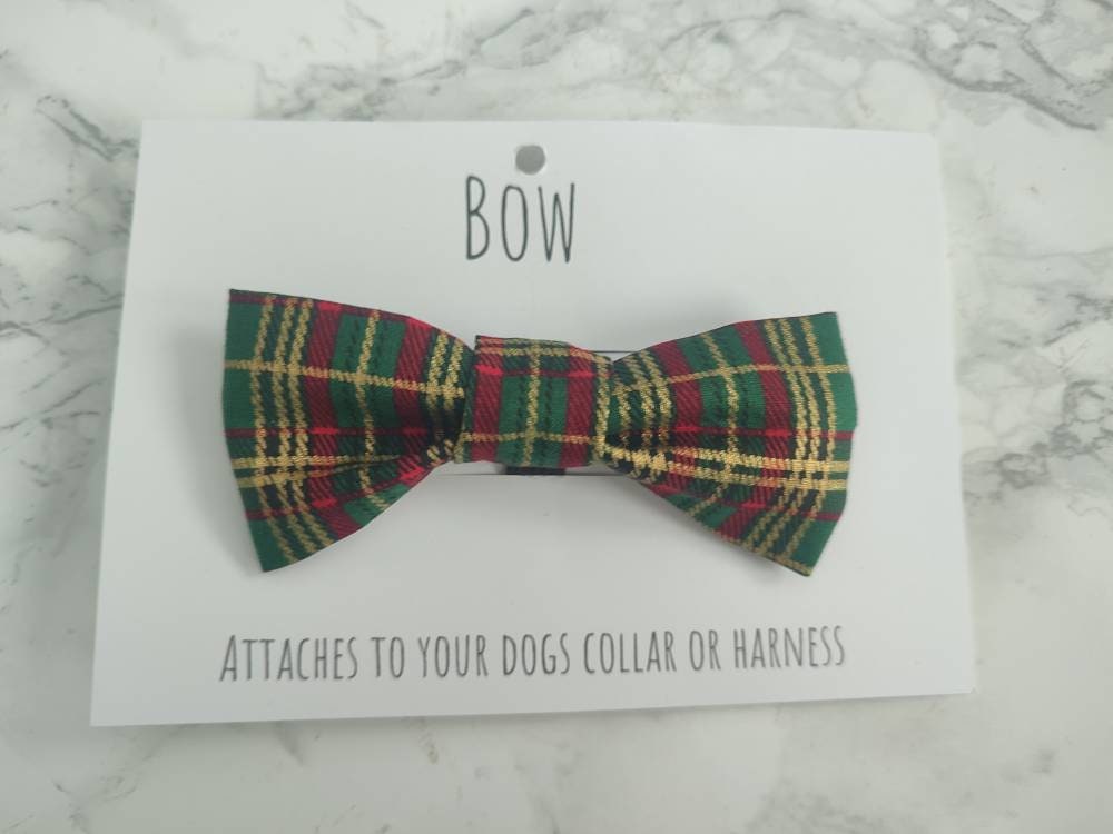 This cute Green tartan dog bow is the perfect easy fit accessory for your dog this christmas! It features a green tartan print with metallic gold stripes. It attaches to your dogs collar with one easy hook and loop tape strap, making it easy to put on without having to remove your dogs collar.