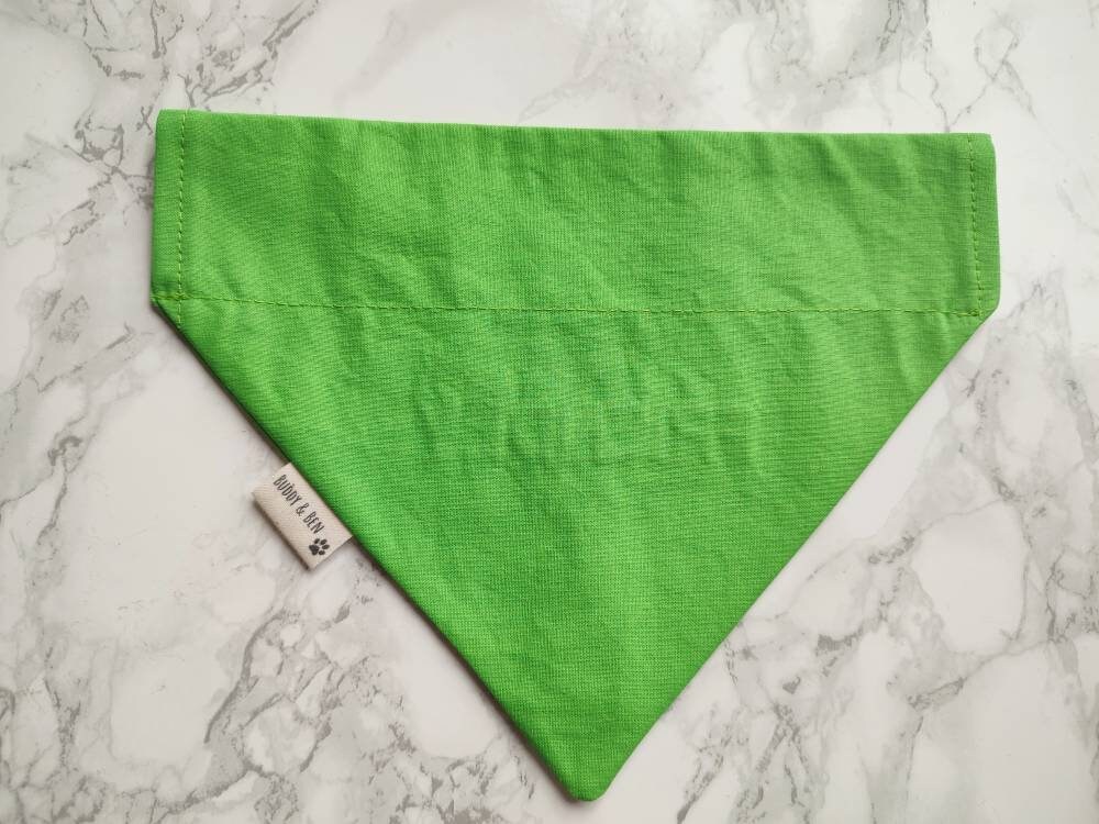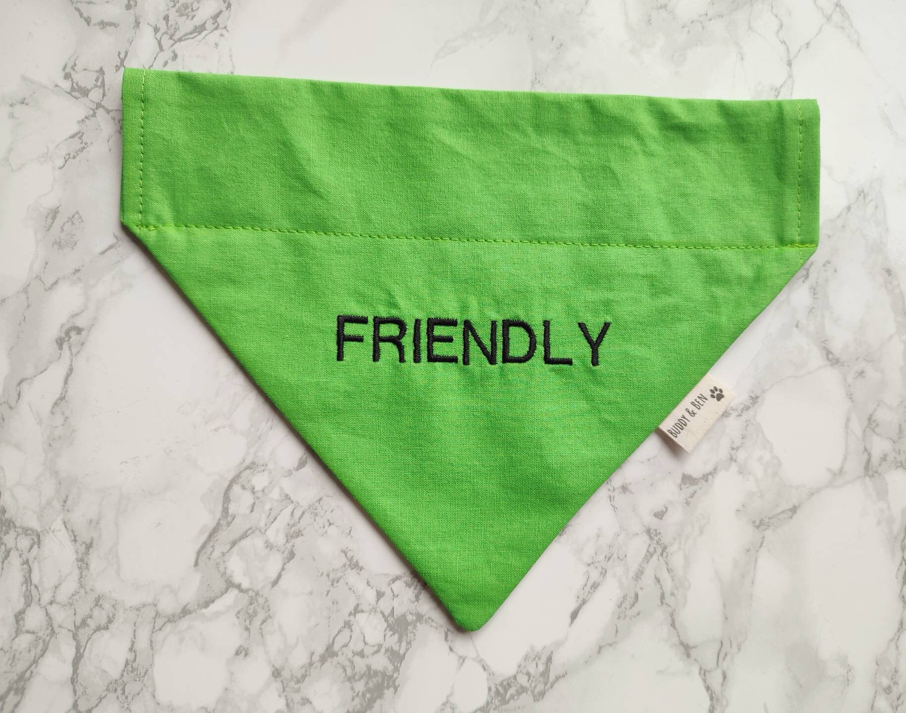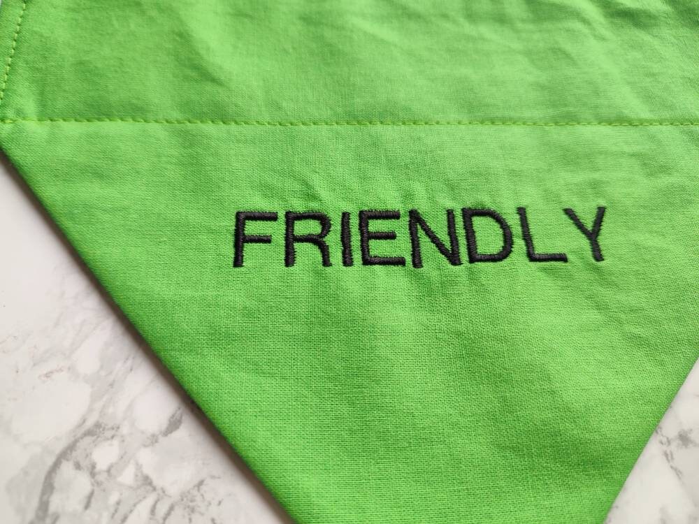 Friendly dog bandana. For friendly dogs who want to let the world know they aren't scary as they look! This bandana is made from green 100% cotton fabric, with the slogan 'Friendly' embroidered on the front side of the bandana in black thread. The reverse side is plain green and has no writing. The embroidery makes this bandana more durable when washing as opposed to vinyl lettering. Want a bandana like this but with different text? - I take custom embroidery requests just drop me a message before ordering to discuss you're requirements