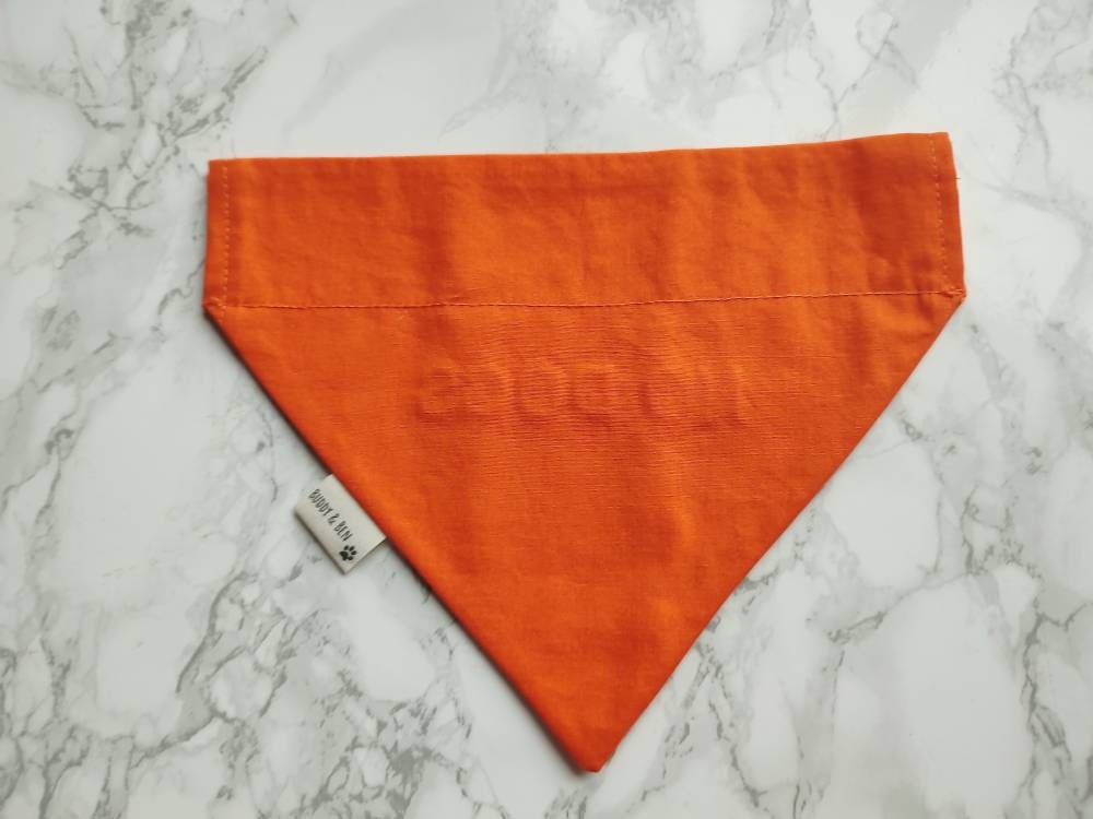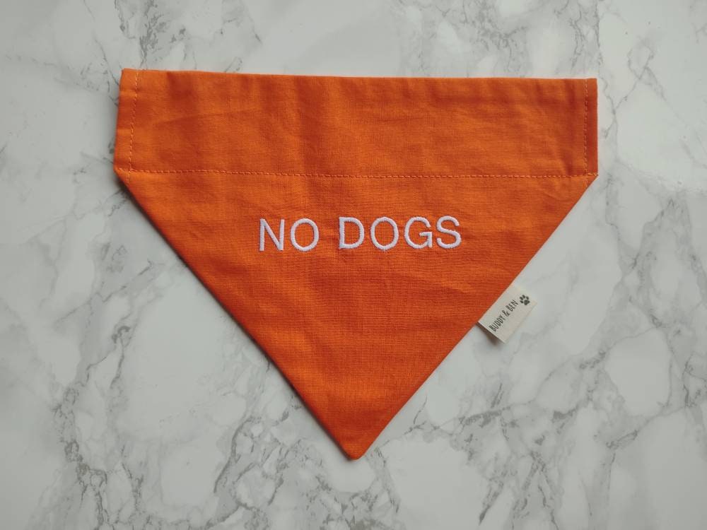 No dogs bandana. For dogs who need their space away from other dogs! Ideal for dogs who like to get out and about but are not keen on other dogs. This bandana is made from orange 100% cotton fabric, with the slogan 'No dogs' embroidered on the front side of the bandana in white thread. The reverse side is plain orange and has no writing. The embroidery makes this bandana more durable when washing as opposed to vinyl lettering.