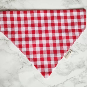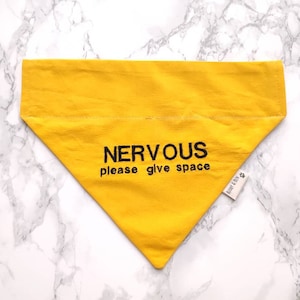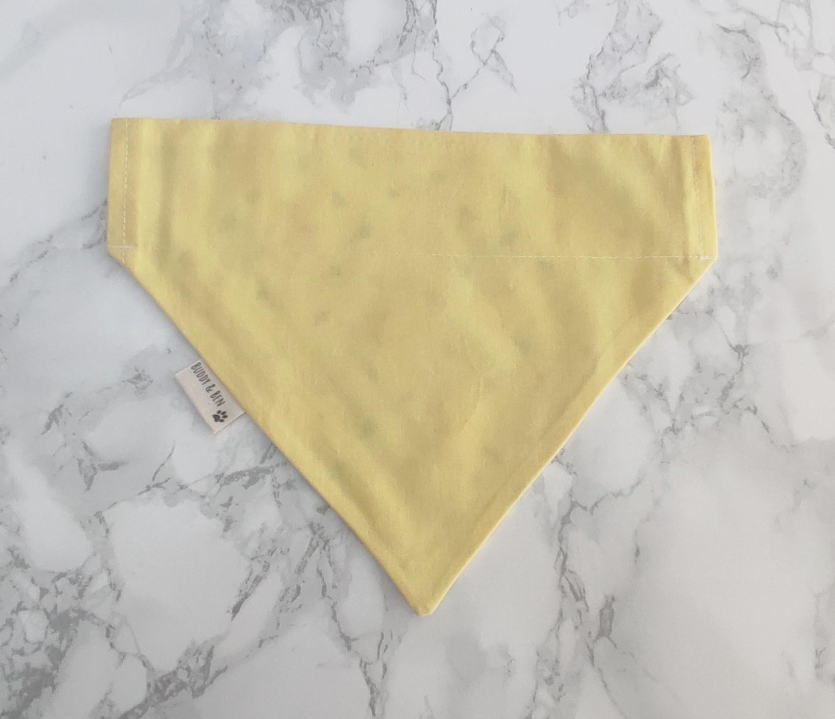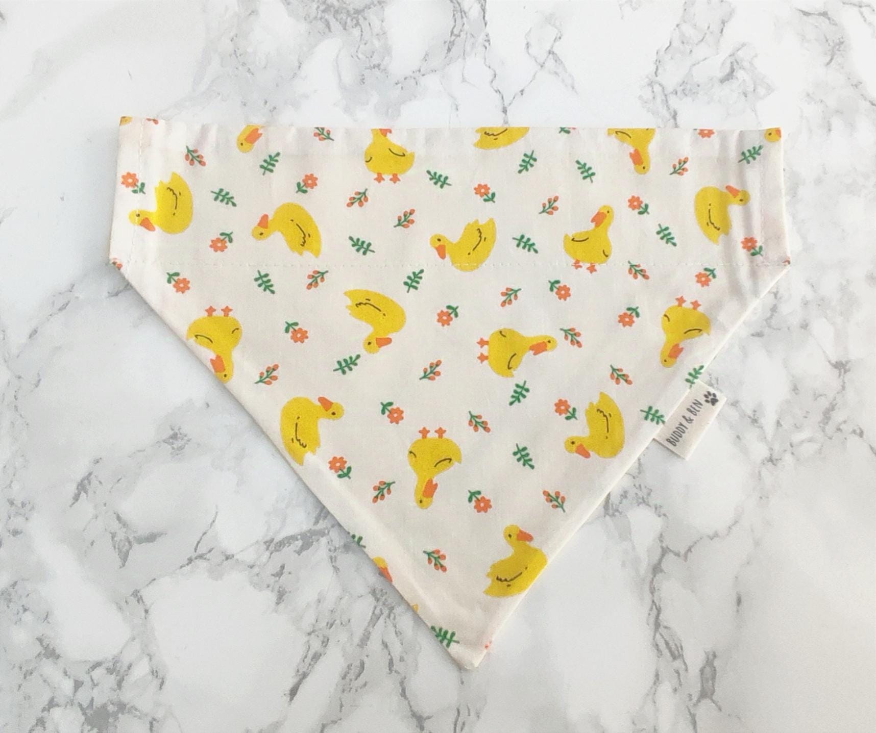 Little ducks Dog Bandana. This bandana features little yellow ducks on a white background, with a pale yellow cotton fabric on the reverse.