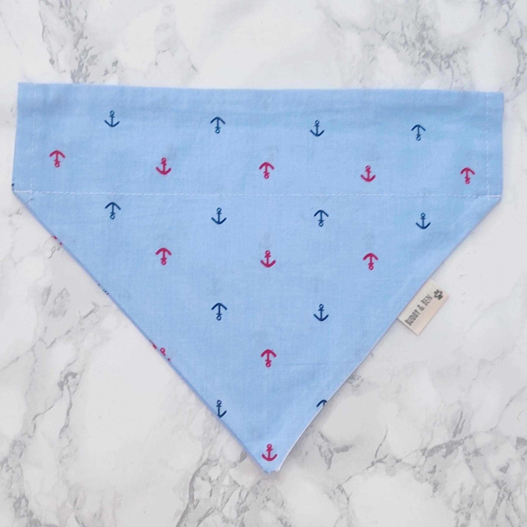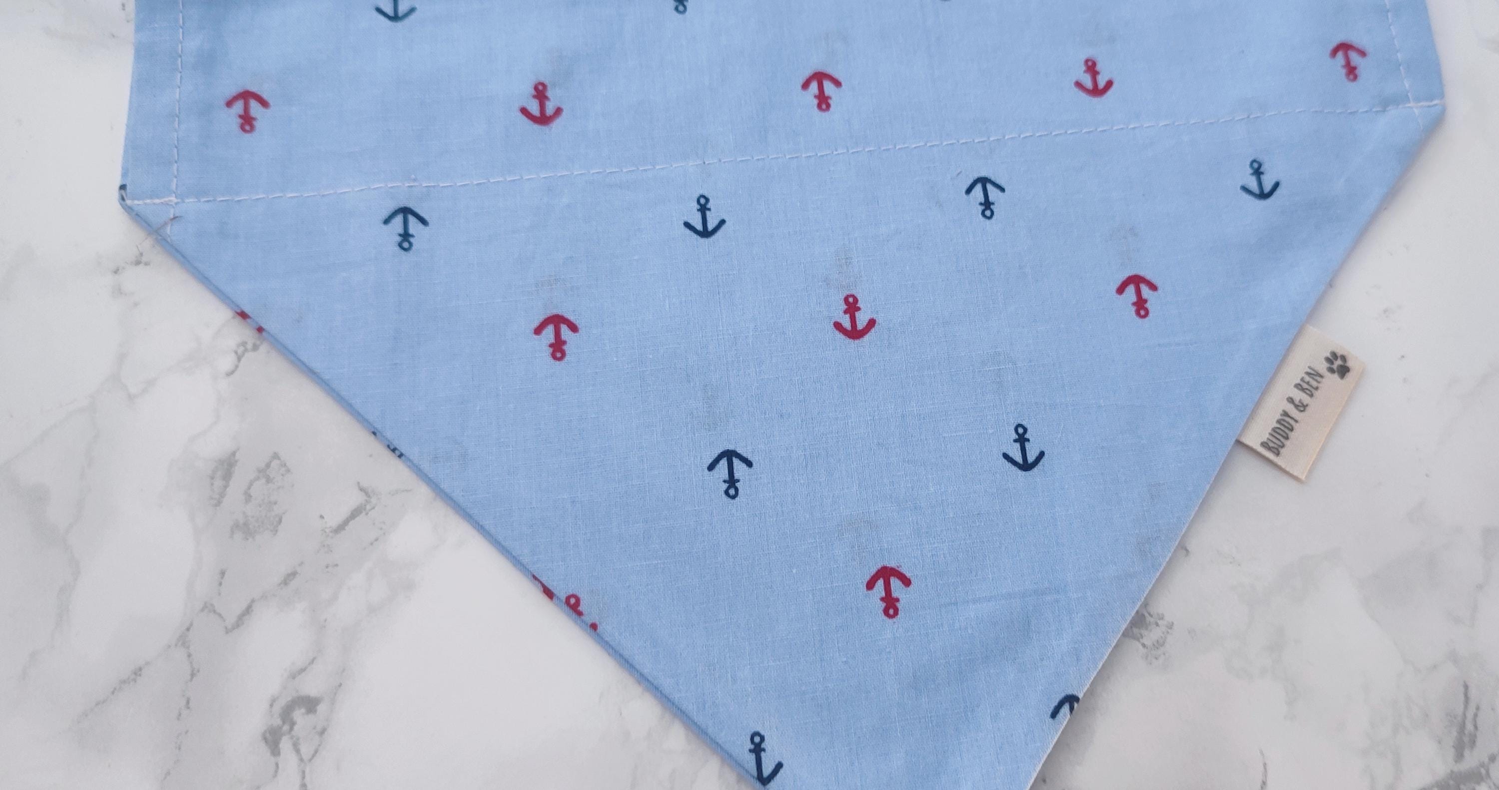 A gorgeous blue dog bandana featuring little navy and red anchors, perfect for trips to the seaside!