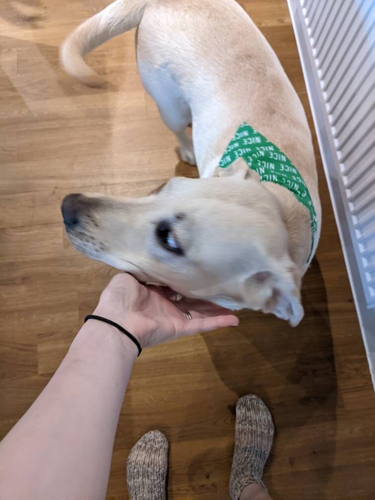 The large fits my brother's Labrador perfectly! Stayed on the "nice" side all day, so she must have liked it ☺️